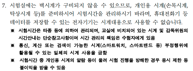 저장기능이 없는 단순한 시계는 허용되며 스마트워치는 절대 불가다. 개인용 손목시계나 탁상시계를 시험 중에 이용하는 것이 허용된다. 물론 대부분의 교실에 벽시계가 준비되어 있긴 하지만 매번 칠판 쪽을 쳐다보며 시간을 계산하기엔 너무 촉박하다. 타이머를 준비하여 몇 분이 남았는지 직관적으로 볼 수 있어야 시험에 혼선이 없다.