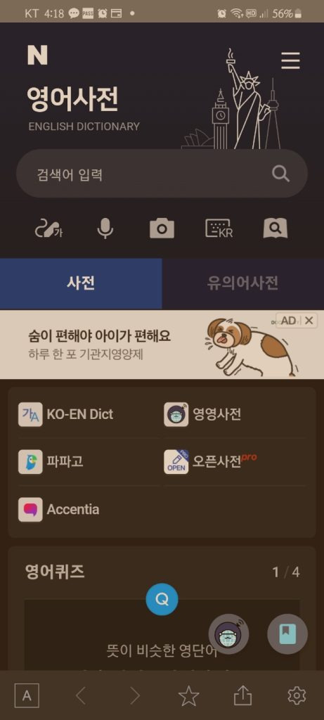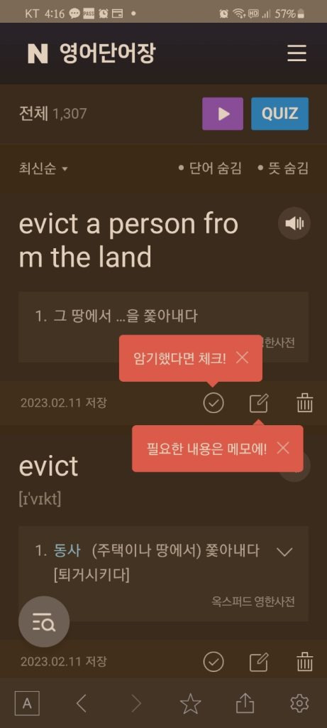 네이버의 사전에는 단어를 스크랩할 수 있는 기능이 있다. 스크랩을 해놓고 검색해서 볼 수 있으며 발음까지 반복해서 들으면서 학습할 수 있다. 예문은 물론이고 숙어까지 저장할 수가 있어 반복 학습하기가 너무 편하고 좋다. PC버전보다는 휴대폰에 설치하여 짬짬이 단어장을 보는 것을 추천한다.