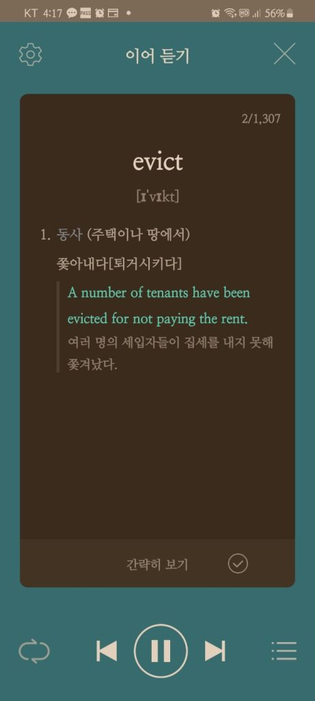 공부하고 있는 문법책을 비롯해서 독해집 그리고 모의고사를 풀면서 모르는 단어와 숙어는 모두 '네이버사전 영어단어장'에 저장해 둔다. 직접 눈으로 펼쳐 보아도 좋지만 '이어 듣기'를 통해서 귀에 익숙하도록 한다.
